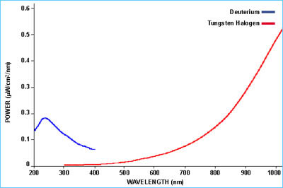 以上光譜圖分別顯示了氘燈(200-400nm)和鹵燈(400-1100nm)的光譜輸出,以避免氘燈譜線中大于400nm時(shí)的尖峰。 SPECIFICATIONS