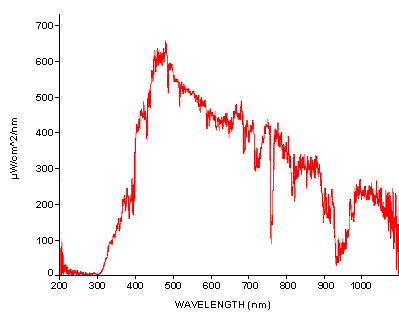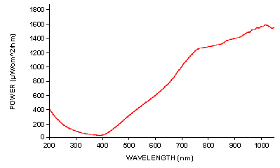 HR4000CG光譜儀使用HC-1光柵,它是一種的可變閃耀波長(zhǎng)光柵,提供的波長(zhǎng)范圍為200-1100nm。(預(yù)配置光柵的波長(zhǎng)范圍為200-1100nm,但是有效的波段是在200-1050nm之間,請(qǐng)參照HC-1光柵效率曲線)。HR4000CG光譜儀還采用了OFLV-200-1100可變長(zhǎng)通濾光片以消除二級(jí)和三級(jí)衍射的影響。光柵和濾光片在出廠時(shí)就已經(jīng)安裝并固定。 光學(xué)平臺(tái) HR4000CG光譜儀使用"HR"光學(xué)平臺(tái),5um入射狹縫,并且升級(jí)為UV4紫外窗片,用來(lái)增強(qiáng)光譜儀在紫外區(qū)的響應(yīng)。HR4000CG光譜儀是HR2000CG光譜儀的升級(jí)產(chǎn)品,使用3648像元的線性CCD陣列探測(cè)器,并且在200-1100波長(zhǎng)范圍內(nèi)提供好的光學(xué)分辨率。 USB2.0和數(shù)字輸入/輸出接口 HR4000CG光譜儀通過(guò)USB接口與PC連接,軟件從光譜儀上讀取設(shè)備的配置參數(shù)。HR4000CG光譜儀還提供10個(gè)可編程的數(shù)字輸入/輸出接口,一個(gè)模擬輸入口和一個(gè)模擬輸出口。 HG4000CG的光譜 太陽(yáng)能光譜